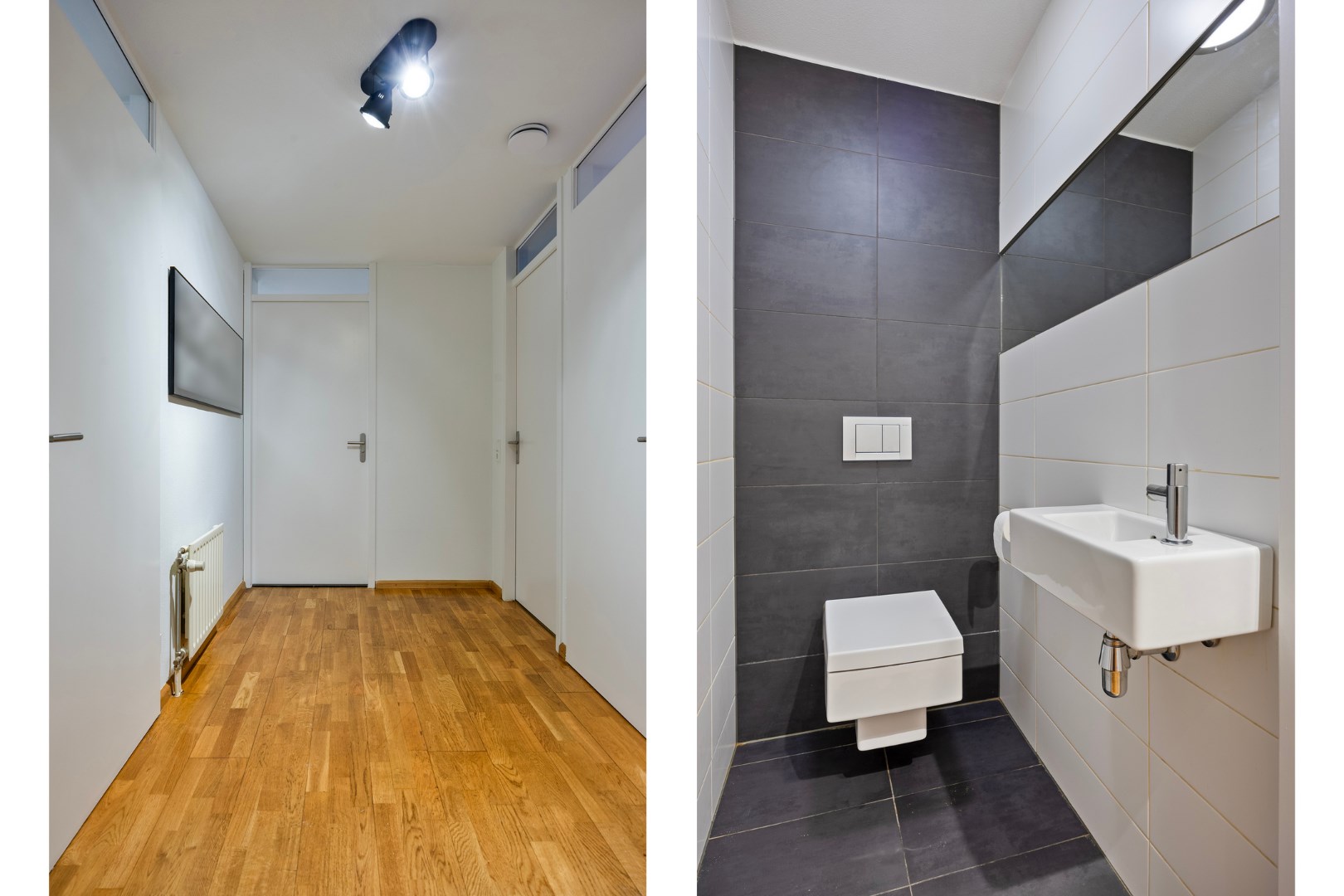 Separaat geheel betegeld toilet met wandcloset en fontein.