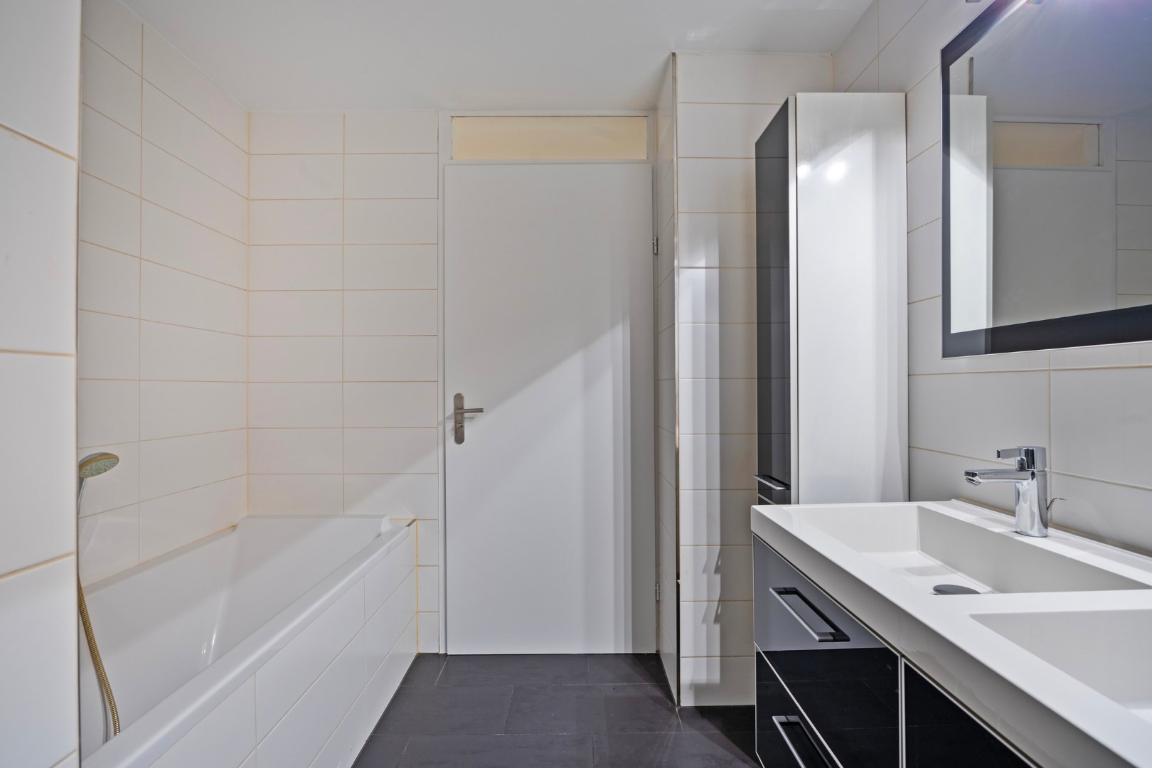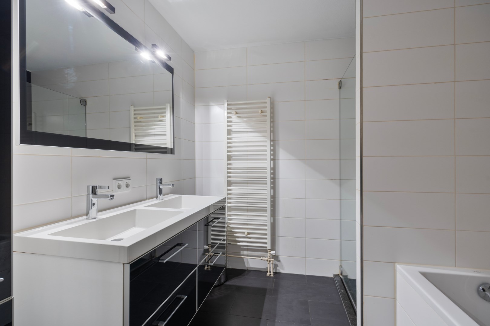 Geheel betegelde badkamer ca. 6 m² met ligbad, douche met glazen douchedeur en 2 vaste wastafels met een onderkast.