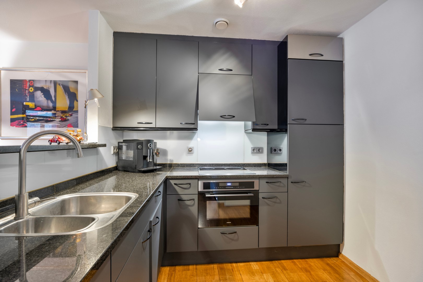 Open keuken met een inrichting die in een hoekopstelling is geplaatst en is voorzien van een inductiekookplaat, afzuigkap, oven, vaatwasser en een koelkast. De keukenkastjes zijn medio 2024 vernieuwd.