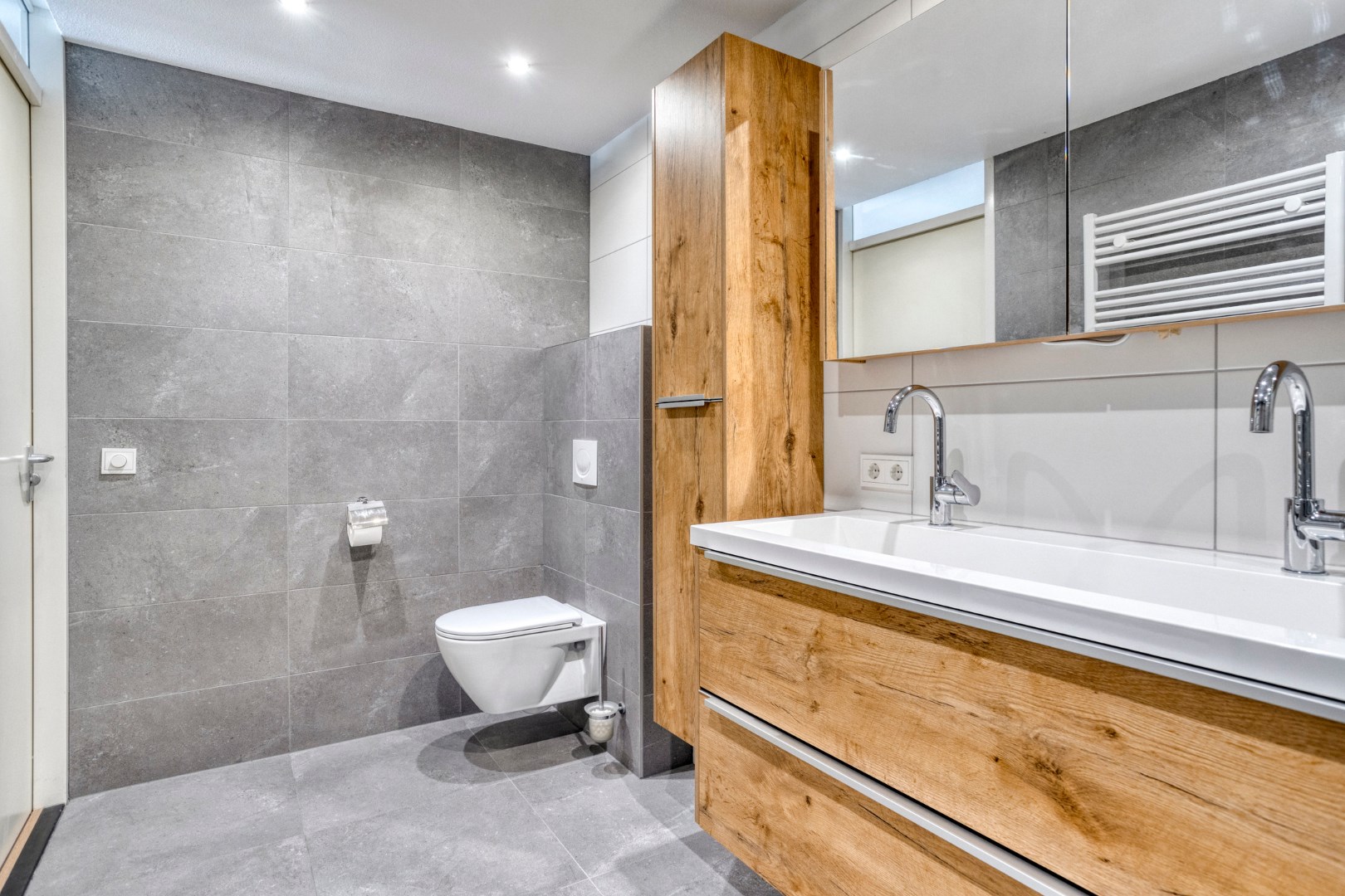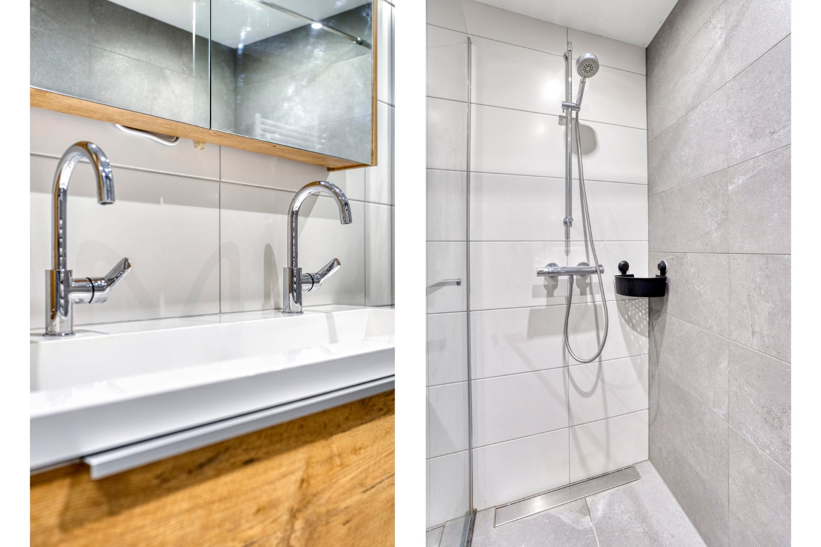 Geheel betegelde badkamer ca. 7 m² met inloopdouche voorzien van glazen douchewand, dubbele wastafel met een onderkast en een wandcloset.