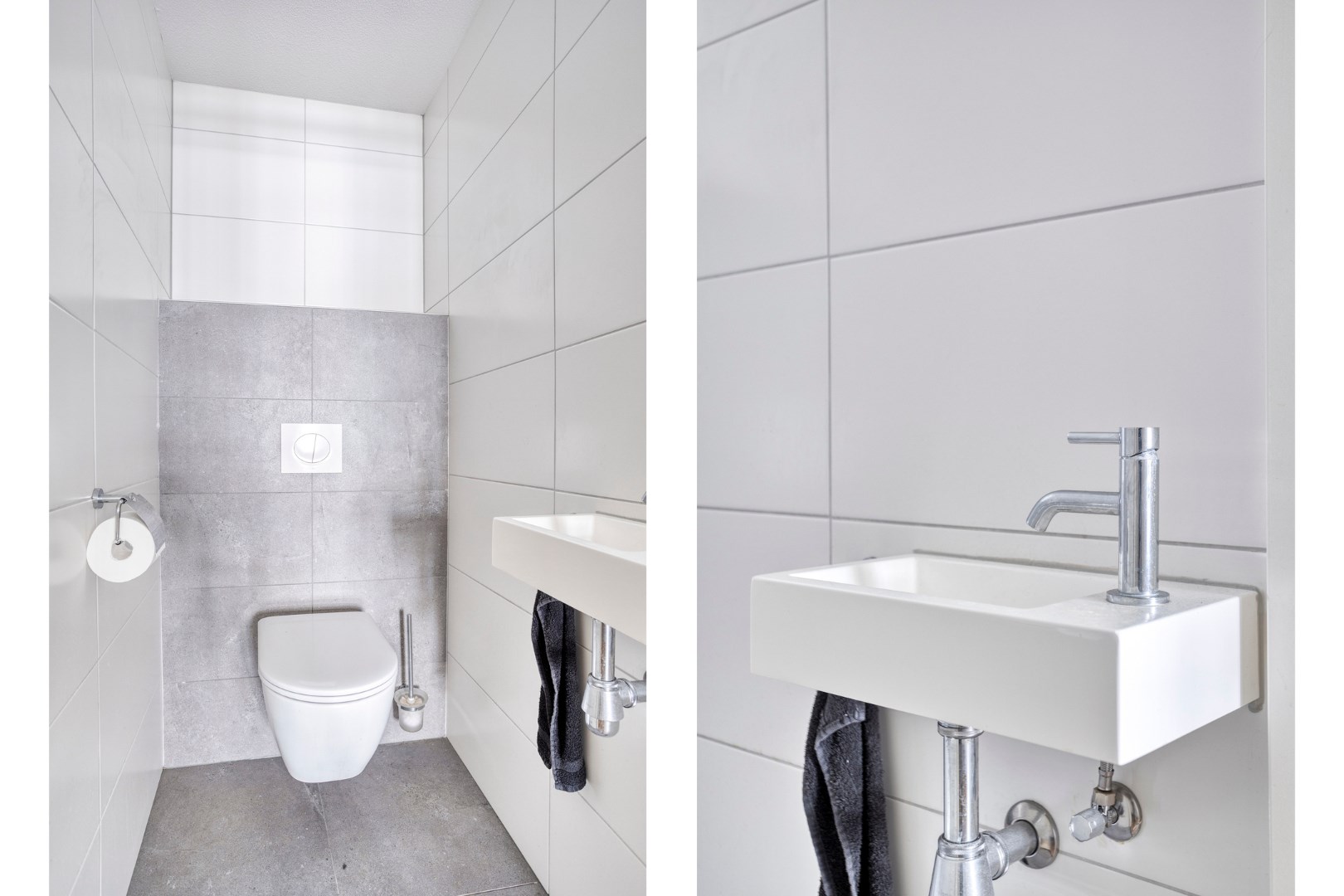 Geheel betegeld gastentoilet met wandcloset en fontein.