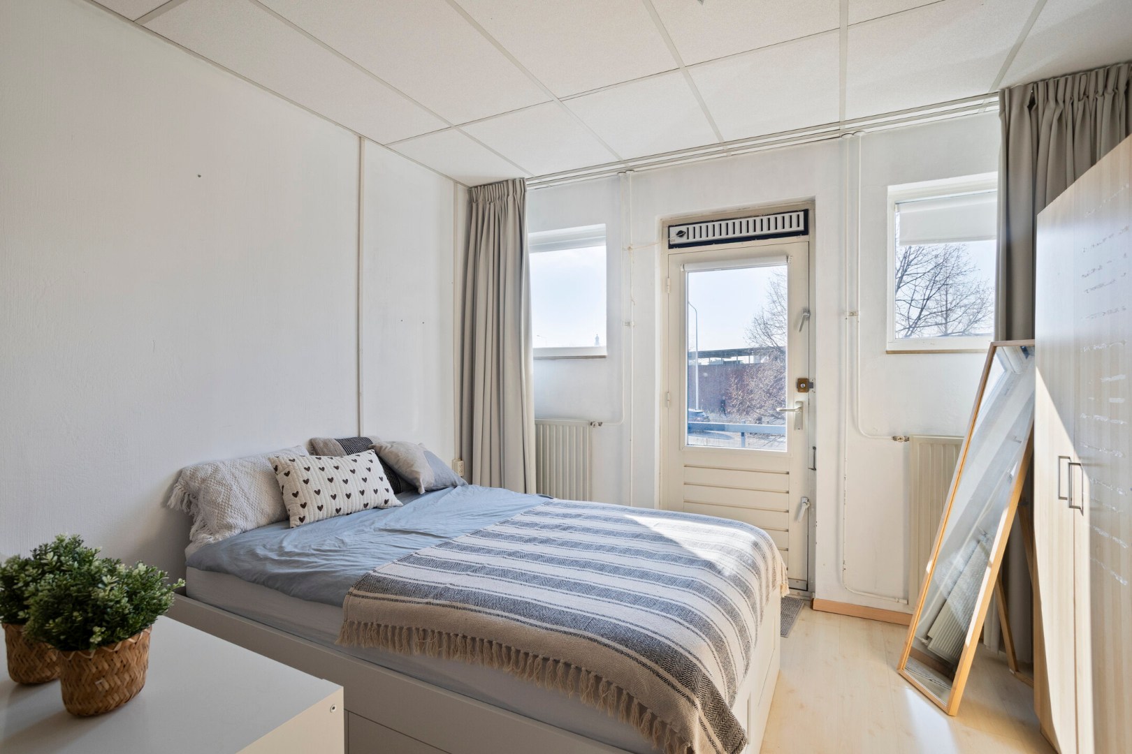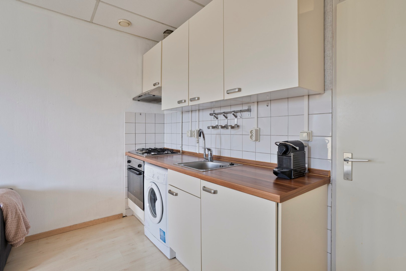 De praktische gordijnen, het bed, kast en de wasmachine blijven achter en zijn in de koopsom begrepen.