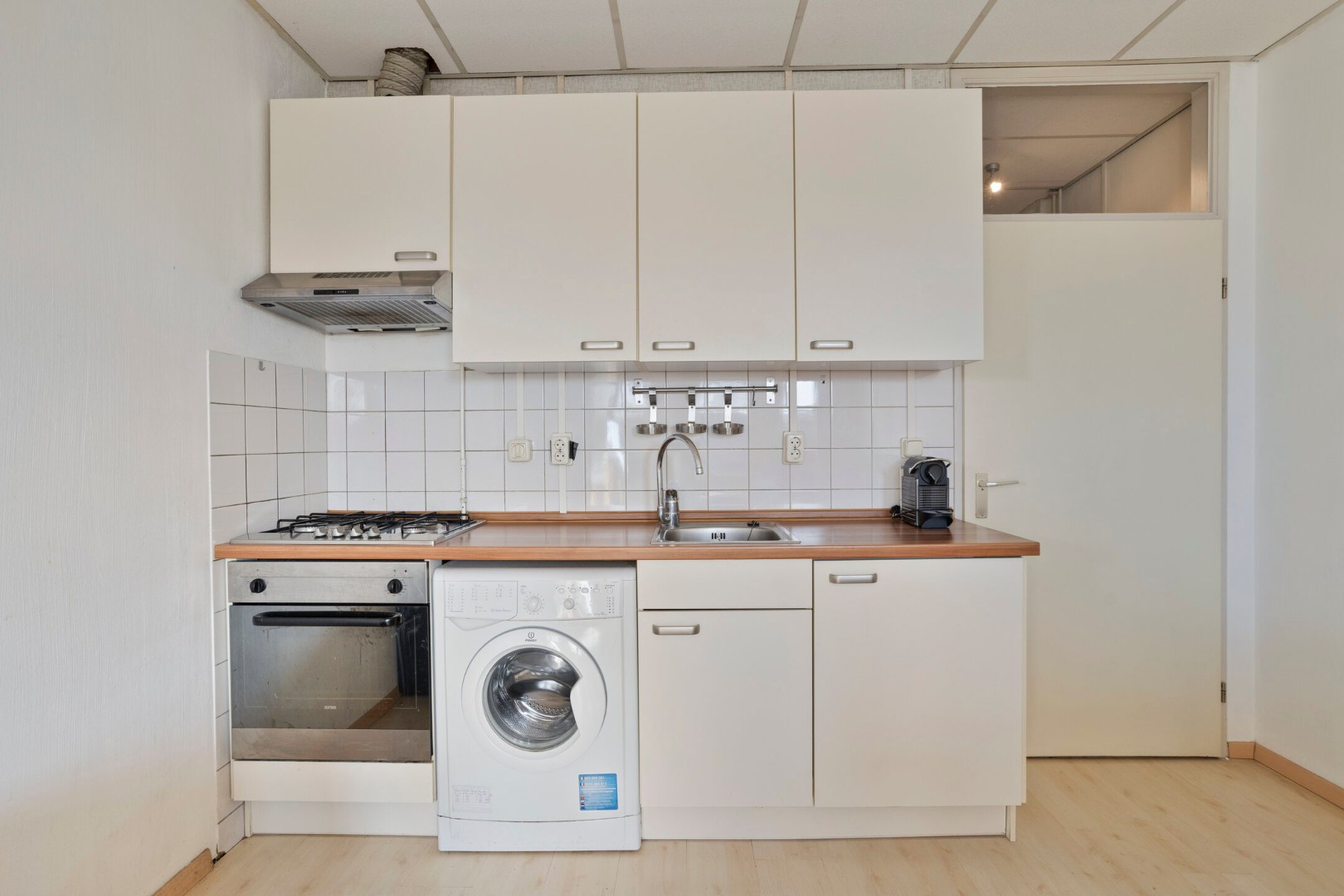 De keukeninrichting is voorzien van een 4-pits gaskookplaat, afzuigkap, oven en een koelkast met klein vriesvak.