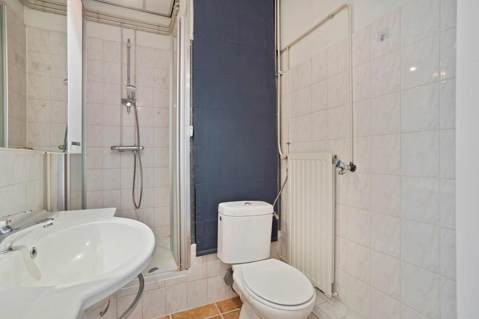 3/4 Betegelde badkamer met douche, vaste wastafel in badmeubel, toilet, wasmachine-aansluiting en de c.v.-combiketel (eigendom).