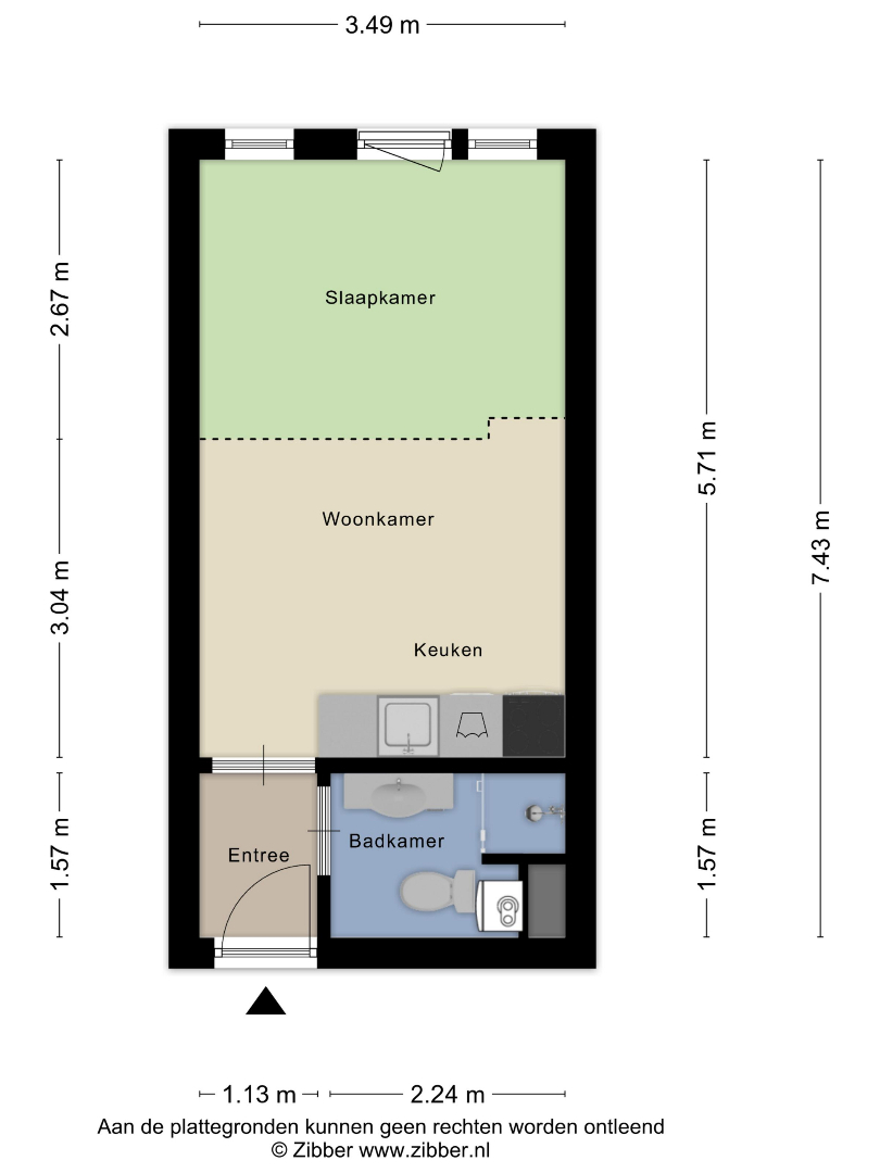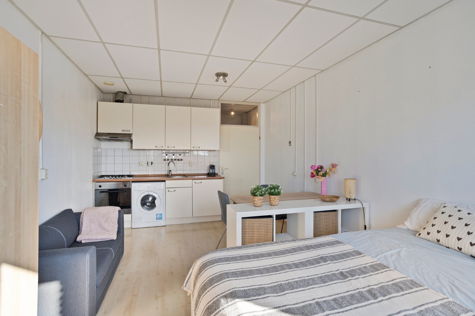 De studio beschikt over een praktische keukeninrichting en een nette badkamer met douche, vaste wastafel en een toilet. Alles is compact, maar efficiënt ingedeeld voor optimaal woongenot.