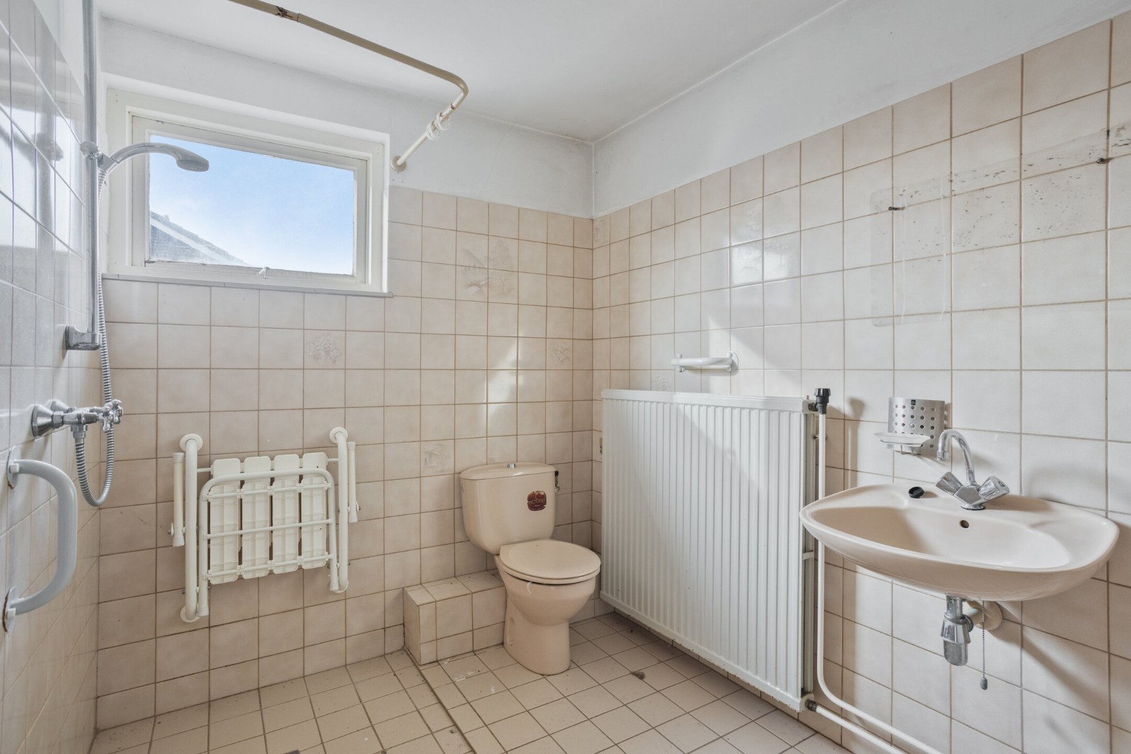 Geheel betegelde badkamer ca. 6 m² met douche, vaste wastafel, toilet en badgeiser.