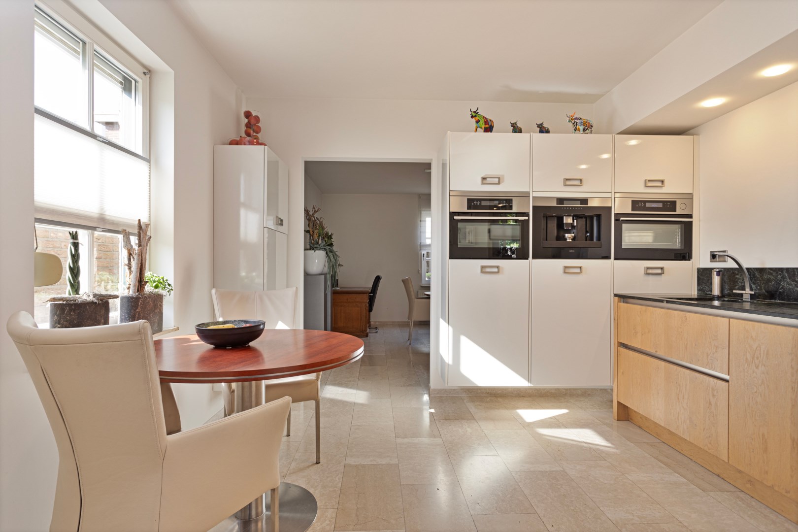 Halfopen keuken ca. 12 m2 met moderne inrichting in hoekopstelling die is voorzien van een inductie-kookplaat, afzuigkap (plafondunit), koelkast, vaatwasser, combi-magnetron, combi-steamer en een koffiemachine. Het aanrecht is voorzien van stenen aanrechtblad.