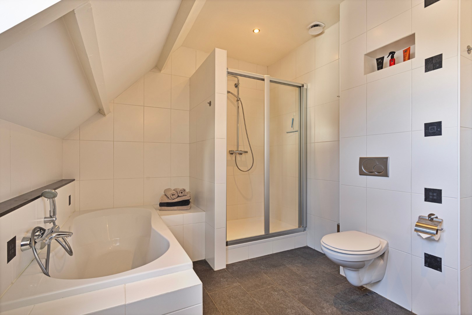 Geheel betegelde badkamer ca. 10 m2 voorzien van een ligbad, ruime douche, wandcloset en een vaste wastafel in een badmeubel.