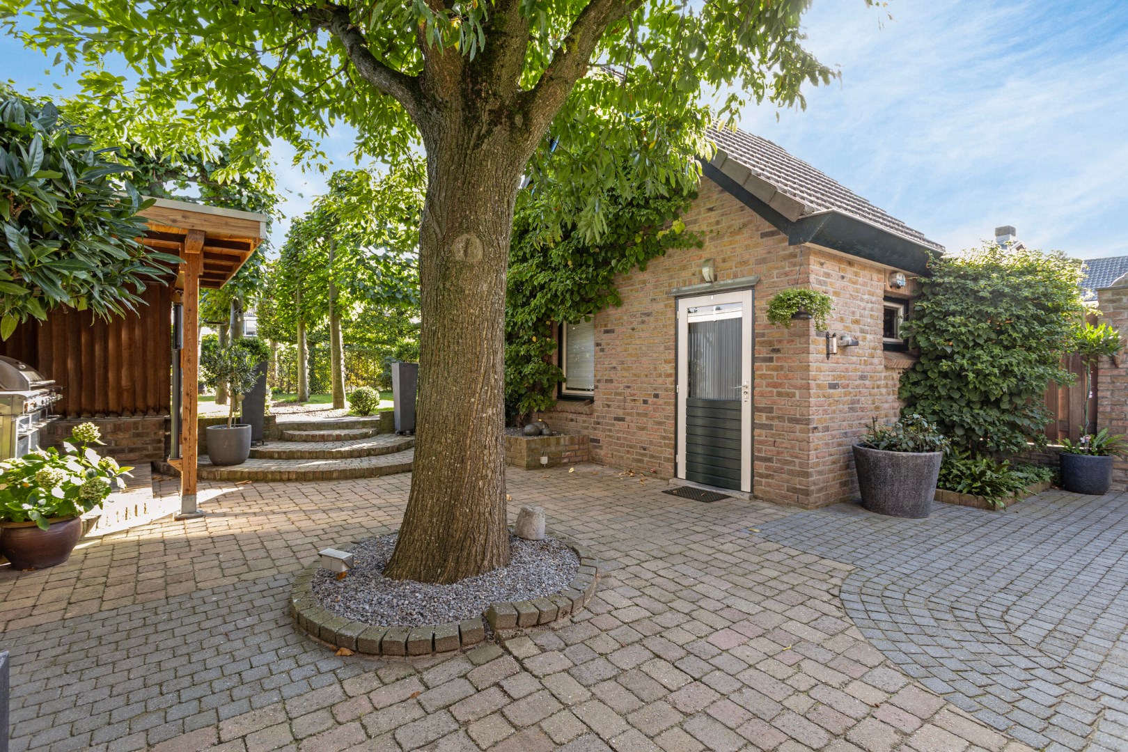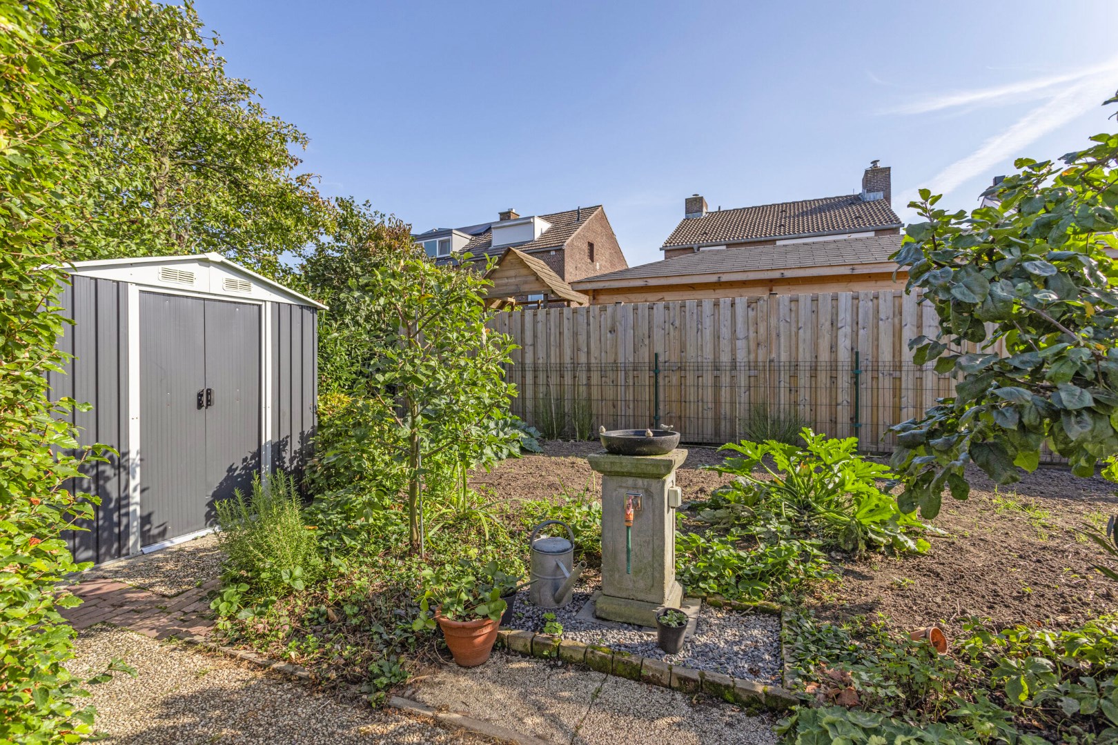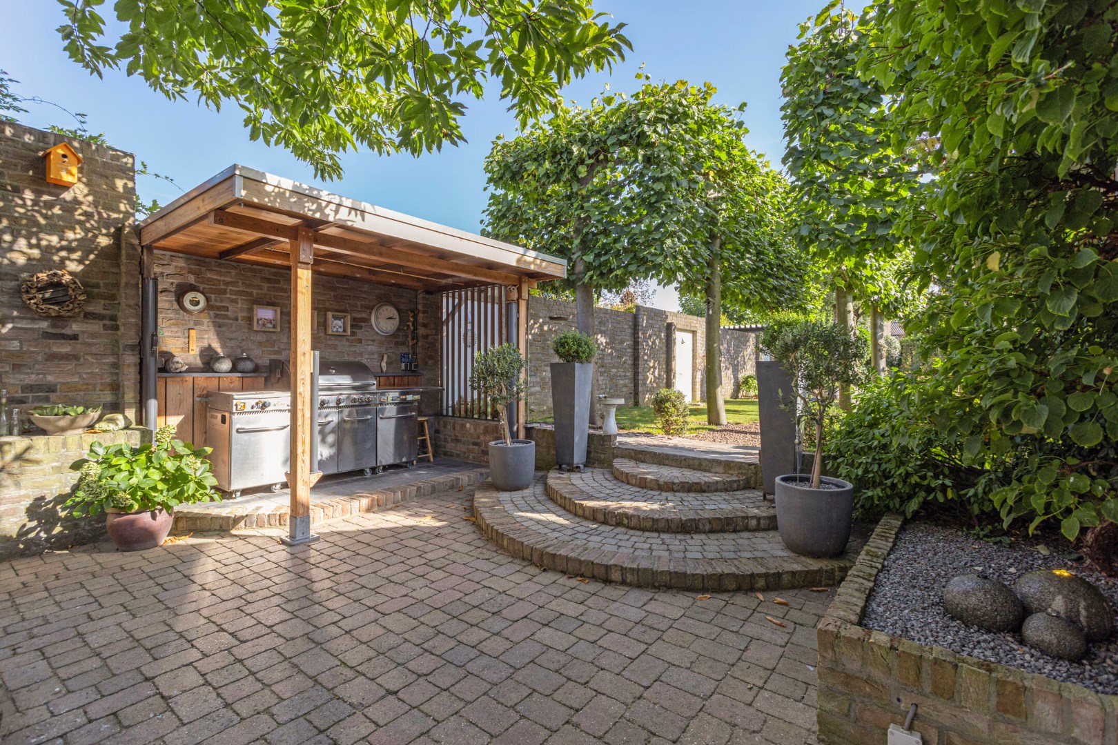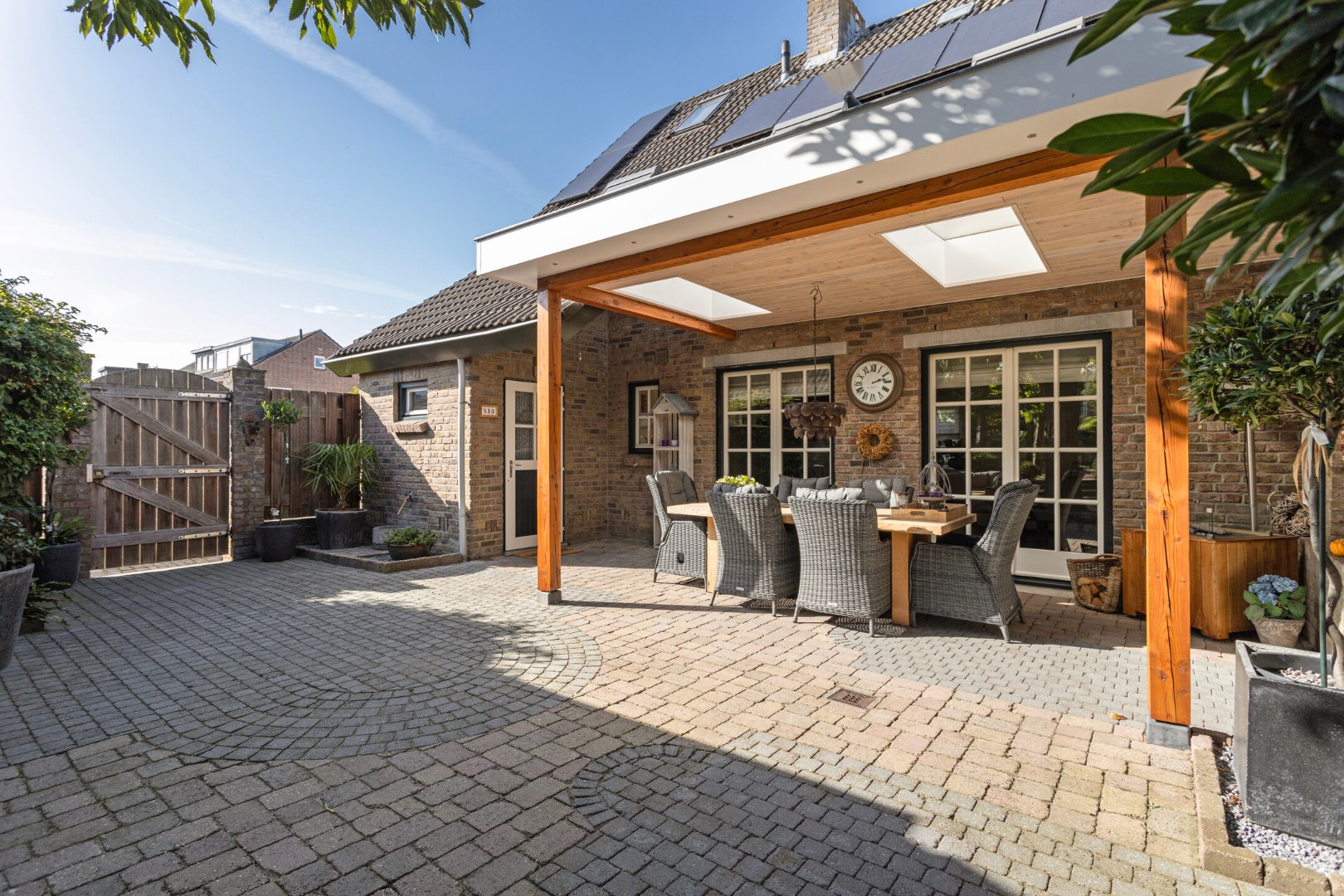 De diepe achtertuin van deze woning is gelegen op het zuiden-zuidoosten. Op het ruime en nagenoeg omsloten terras (ca. 100 m2) vindt u een ruime terrasoverkapping alsmede een apart afdak voor bijvoorbeeld het plaatsen van een buitenkeuken. Er is dus voldoende ruimte om te genieten met gezin, familie of vrienden. Een kastanjeboom geeft bovendien afdoende verkoeling op warme dagen. Het terras is ook via een “achterom” bereikbaar.
