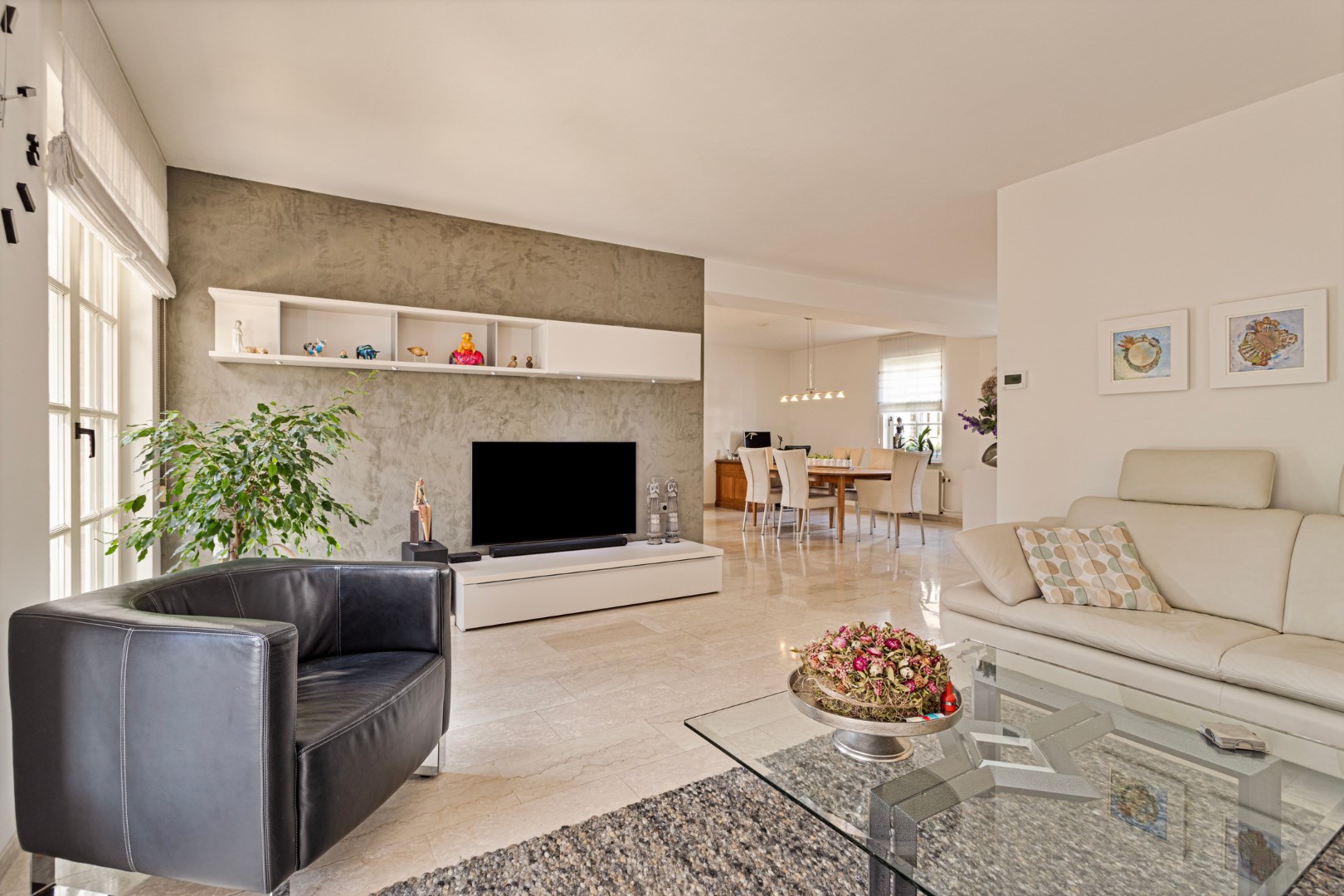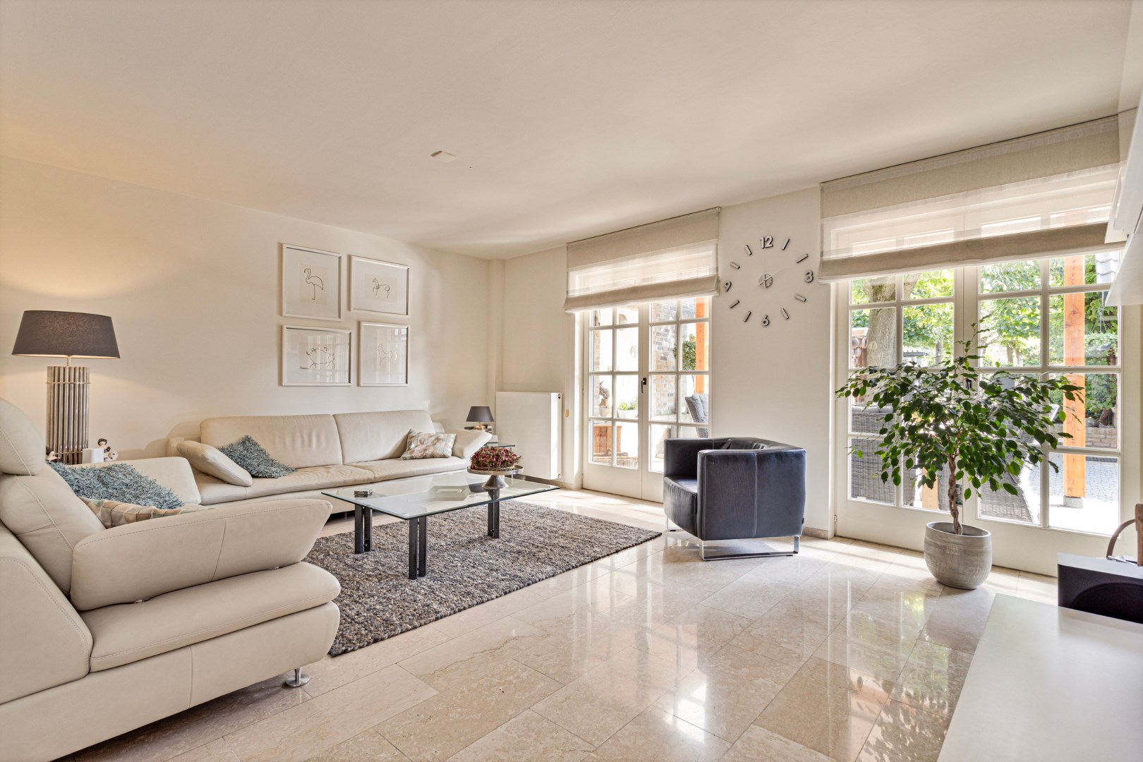 Z-vormige woon- annex eetkamer, totaal ca 49 m2. Vanuit de royale living (ca. 24m2) geven 2 dubbele tuindeuren toegang tot het deels overdekt terras en de achtertuin. In de living is een aansluiting voor een open haard aanwezig.