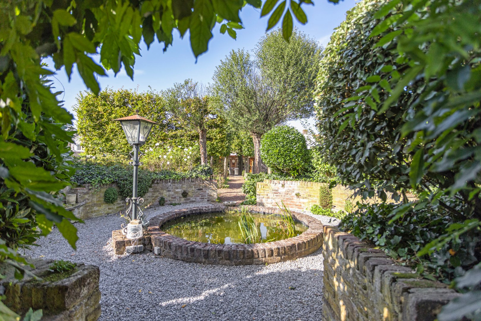 Fraaie, onder architectuur aangelegde diepe achtertuin met diverse volwassen bomen, hagen, gazon, struiken, paden, etc. etc.