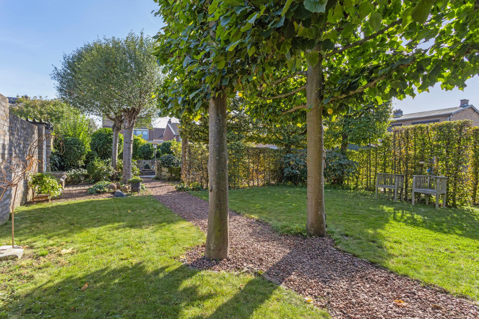 Aansluitend aan het terras is het gazon dat wordt omzoomd door zes volwassen leilindes, drie leibeuken, hagen en beplanting. Vervolgens vindt u een stenen vijver die wordt omringd door diverse struiken en planten.