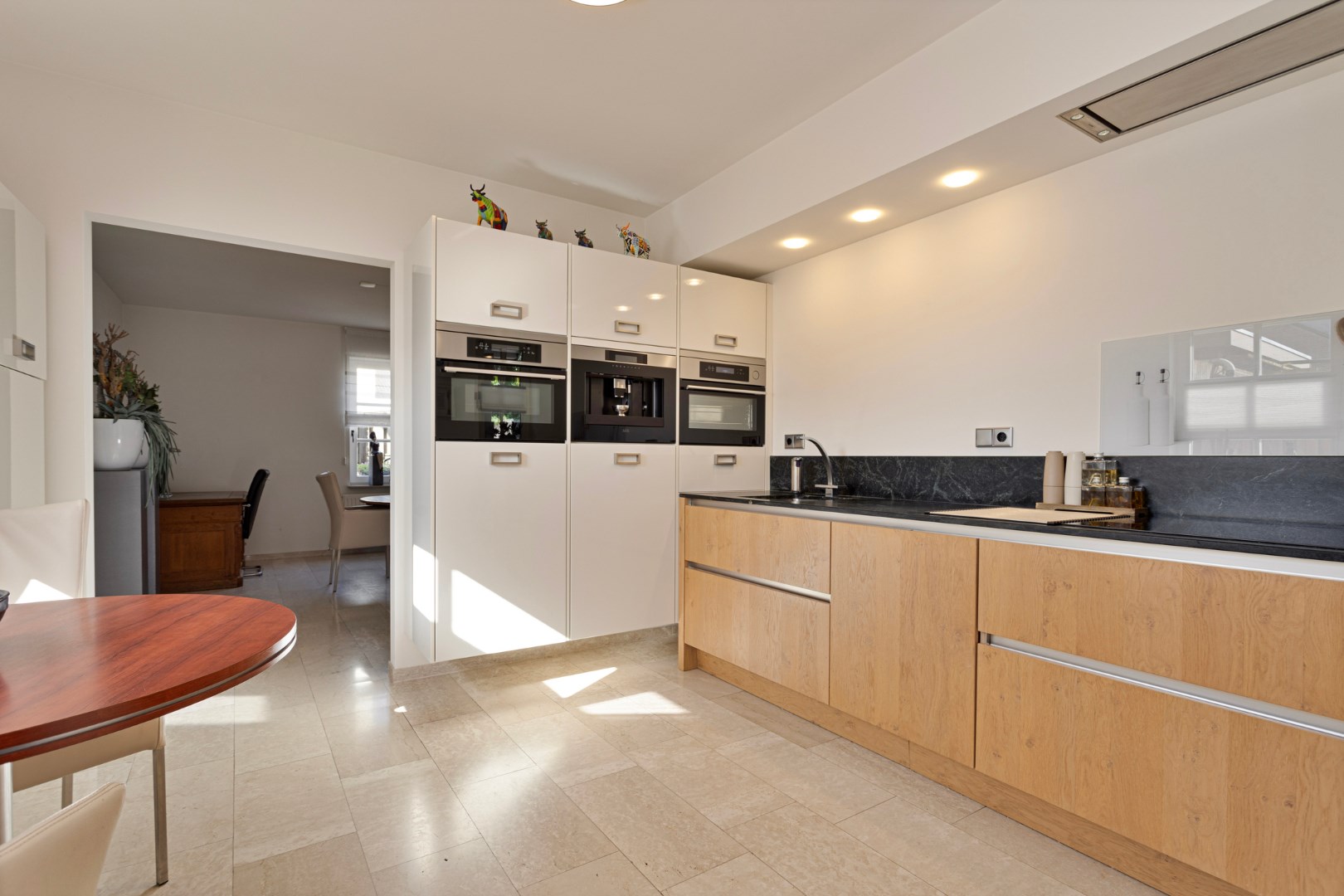 Moderne en luxe keukeninrichting met inbouwapparatuur.