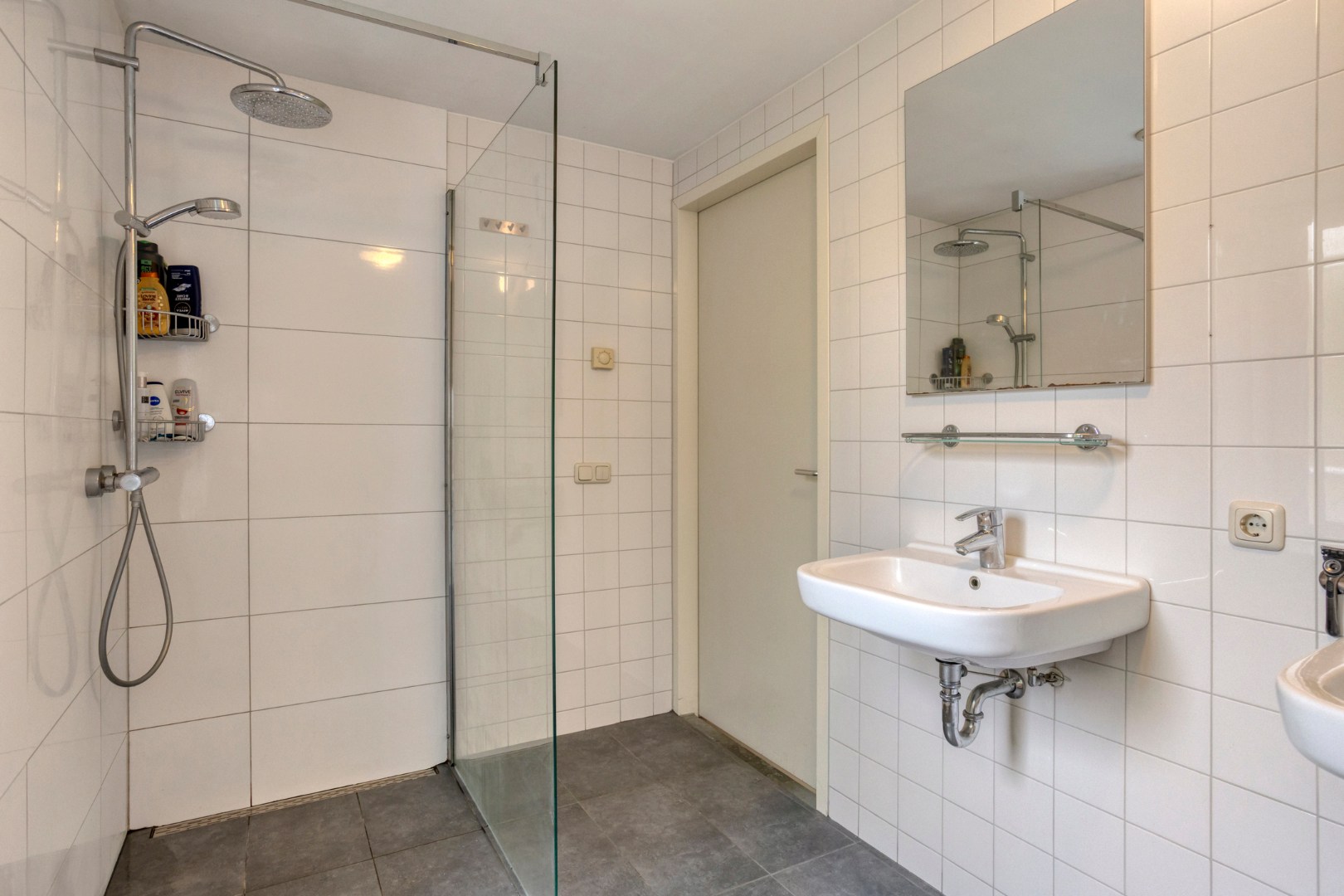 Betegelde badkamer ca. 8 m2 met ligbad, inloopdouche en 2 vaste wastafels. De inloopdouche is in 2023 gerealiseerd.