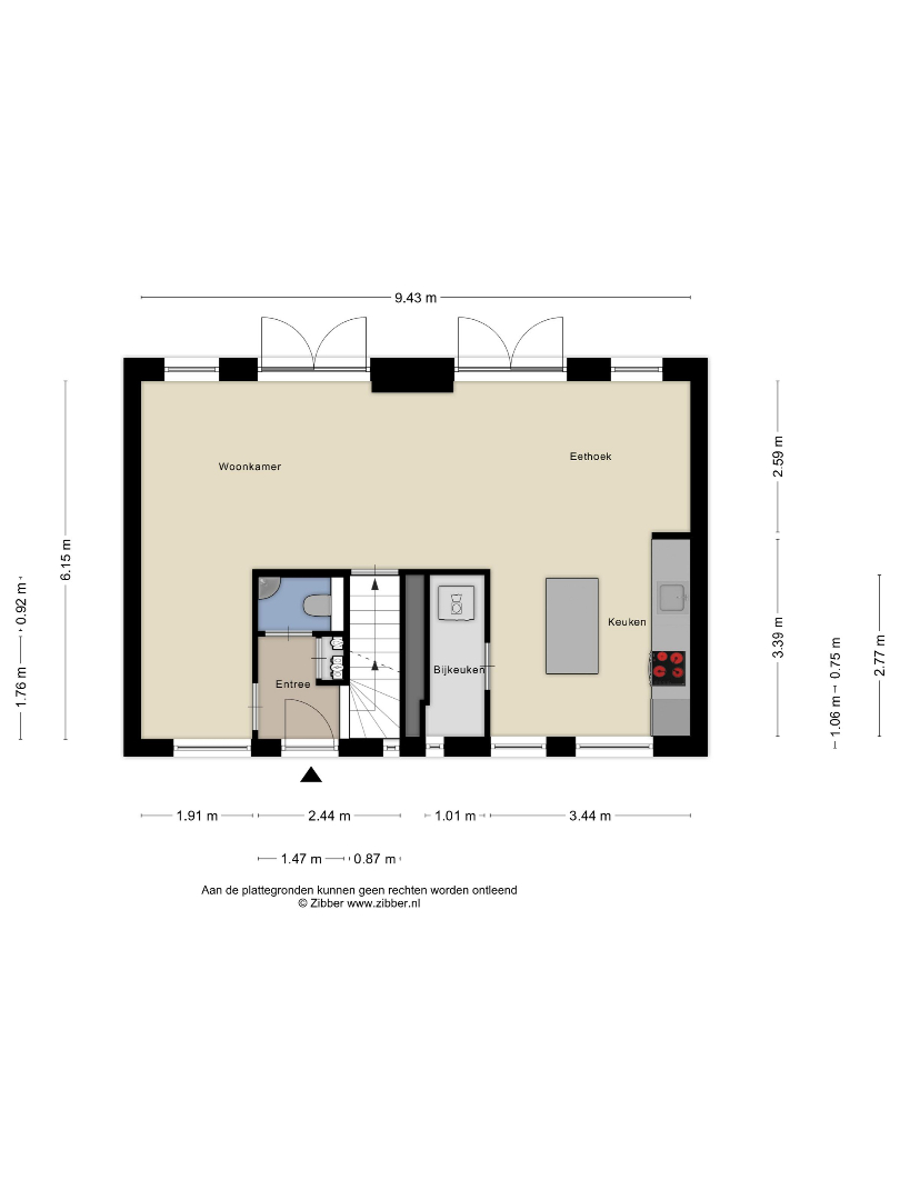 Woonkamer met open keuken, totaal ca. 45 m2. Dubbele tuindeuren geven toegang tot de ruime achtertuin en zorgen voor een goede lichtinval in de woonkamer en keuken.